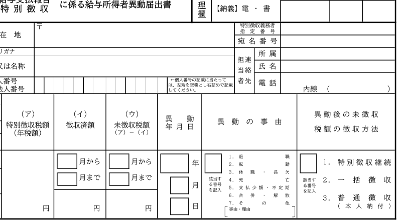 住民税をどの方法で徴収するかを決めて、「給与所得者異動届出書」という書類を提出します。