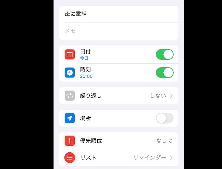 早速、リマインダーに、「母に電話」と言うタスクを登録し、日時を今日20時に設定しておきます。